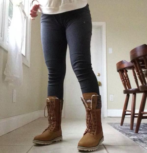 担心这双靴子会让我的脚看起来很大。根本不是这样!我喜欢它们,它们是我最喜欢的一双新鞋。穿厚袜子的时候会有点紧,但我相信它们会像所有的鞋子一样随着时间的推移而伸展。这些靴子配上打底裤和厚袜子,再配上紧身牛仔裤,看起来很可爱。10/10绝对推荐!”- Jackie Kessler