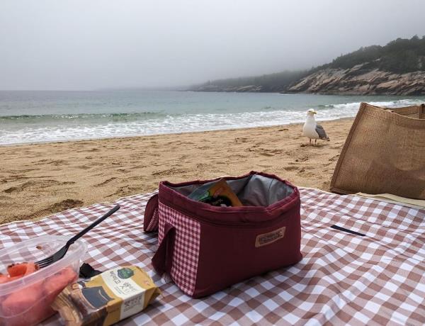 我们两个人很容易就能坐上这个垫子,有足够的空间放我们的午餐盒和其他东西。它足够坚硬,不会压进沙子里,但坐上去很舒服。它和我野餐饭盒的设计很匹配,这也是我选择这条毯子的原因之一