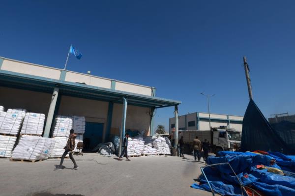 2024年3月13日,联合国工作人员在加沙地带南部拉法的联合国近东救济工程处仓库/配送中心拍照。(图片来源:Mohammed Abed /法新社)